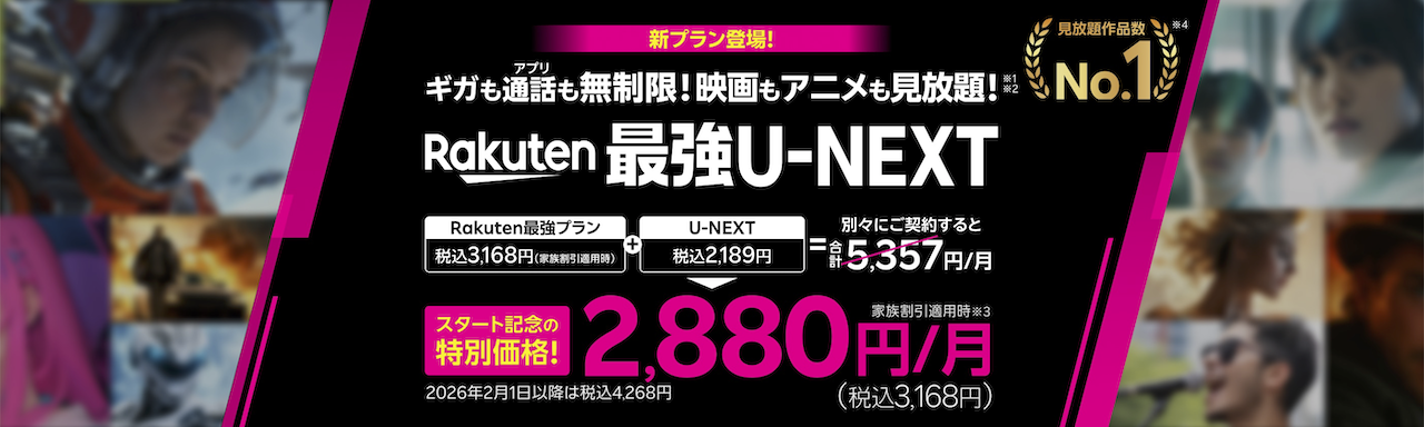 2026年1月末までに申し込むと、月額が1,100円安くなります。つまり3,278円で使えるということ。これはRakuten最強プラン(無制限時)と同額なので、実質U-NEXTが無料で付いてくるような感覚ですね。